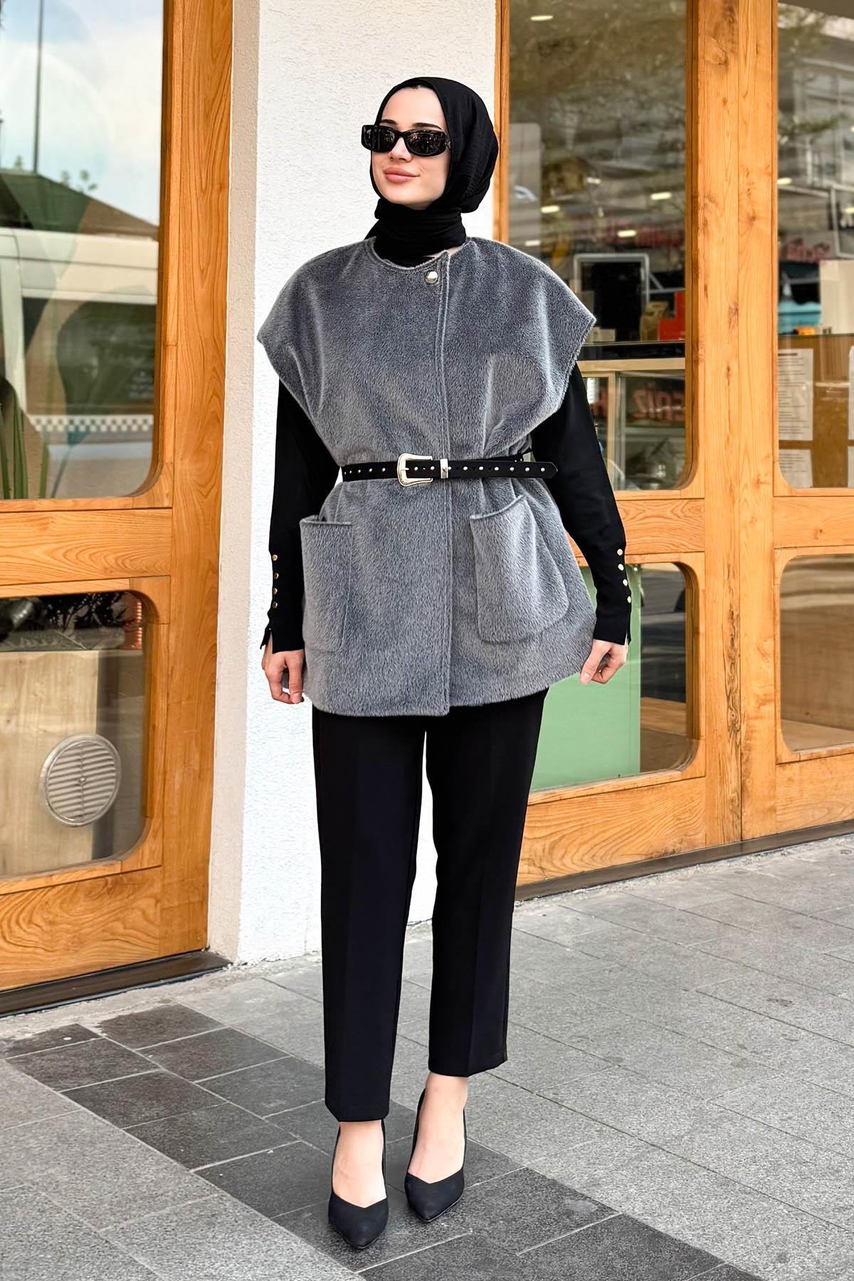 KAŞE CEPLİ KEMERLİ YELEK Gri (YLK1003)